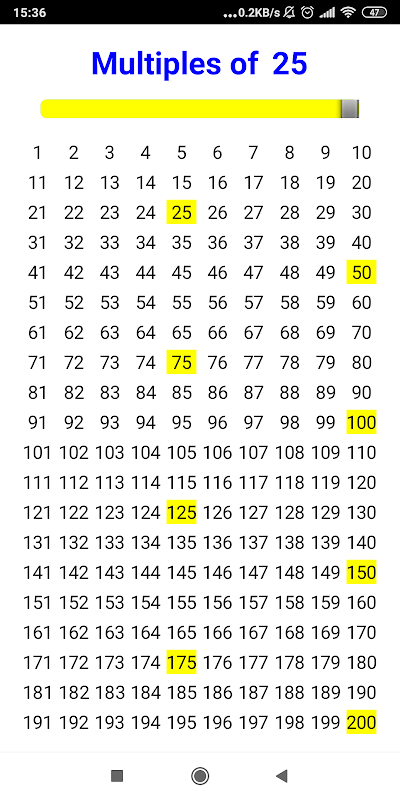 The app shows patterns of multiples for the number from 2 to 25. User may drag the slider to change the number from 2 to 25 to see interesting number pattern generated up to 200 for the multiples of the chosen number.
