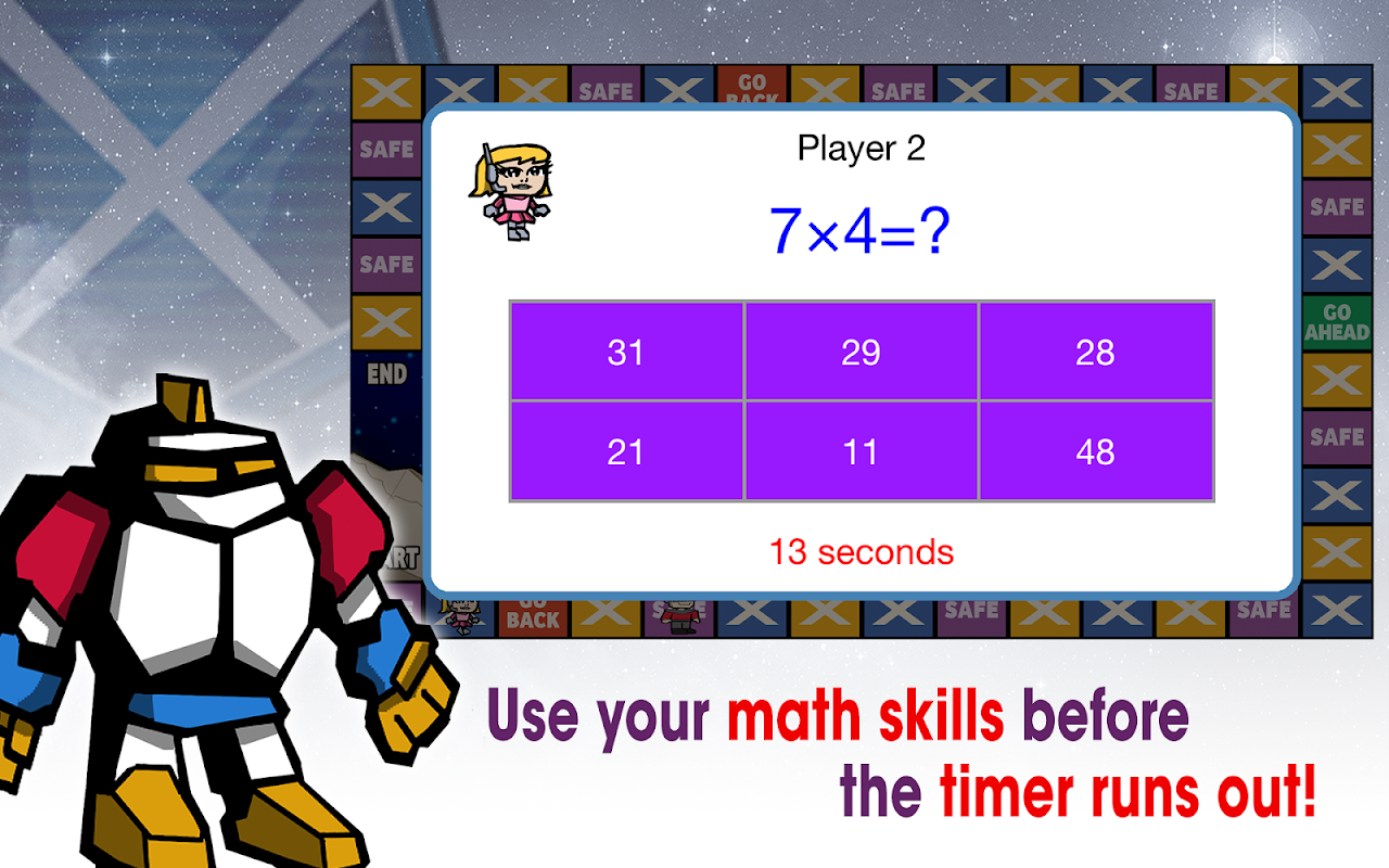 این جهان ضرب است! با تمرین جداول ضرب خود به قهرمان کهکشان تبدیل شوید! در سراسر صفحه پیشرفت کنید و تا جایی که می توانید به سؤالات ضرب پاسخ دهید. بازی در برابر کامپیوتر یا در برابر یک دوست. برای تمام سنینی که می خواهند مهارت های ریاضی خود را به چالش بکشند عالی است.