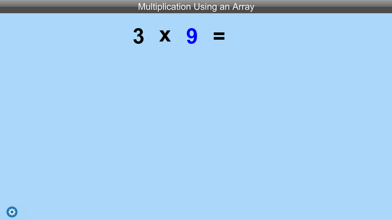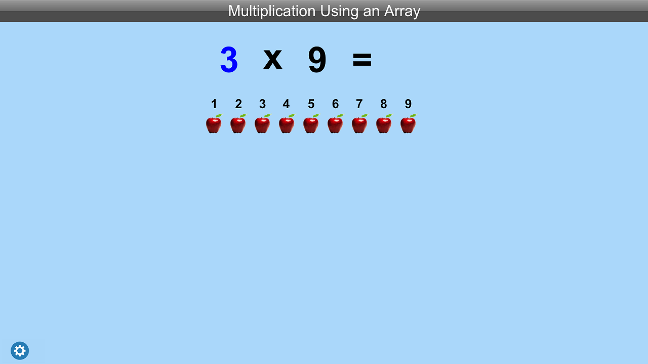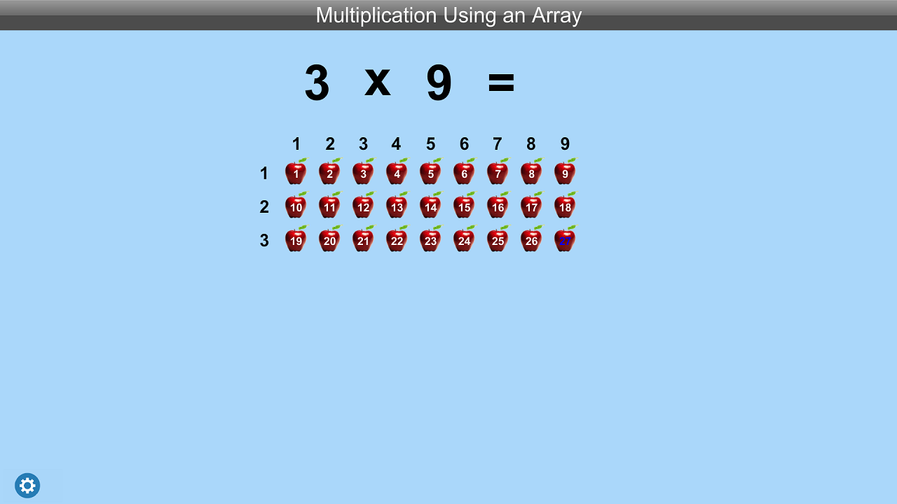 In this program there is an incomplete number statement (for instance, 3 x 9 = ) at the top of the screen. The student clicks the second number (which will be blinking) and a row of nine apples will appear under the problem. The student now clicks the first number (now blinking) and two more rows of nine apples appear under the first row. There are now 3 rows of nine apples. The apples are numbered. The student is told by the program voice to click on the last apple, whose number is the answer. The number rises and completes the number statement.