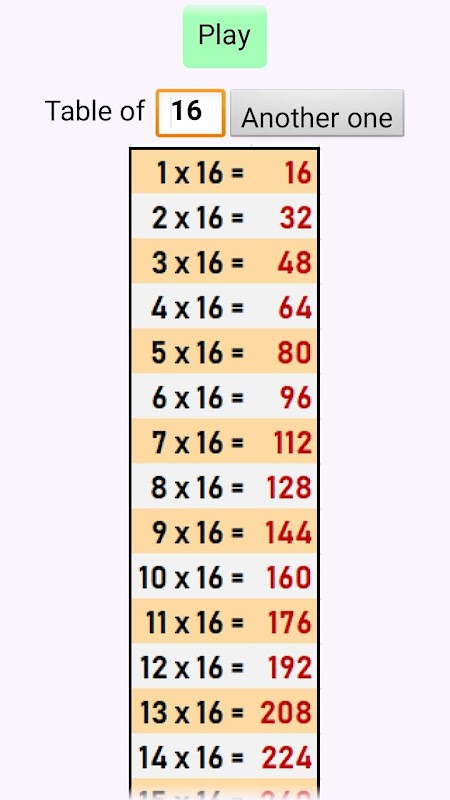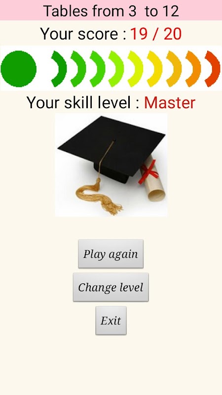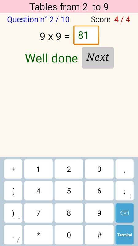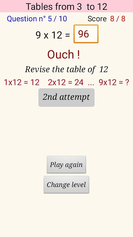 می توان تمام جدول ضرب تا 20 و قطار در یک تست 10 سوال با 5 سطح دشواری، سطح شخصی تر است که اجازه می دهد تا انتخاب کنید که جدول یا جداول (بازدید کنندگان) که در آن ما می خواهم به آزمون را مشاهده کنید. این 2 تست سوال با کمک در صورت شکست در اولین تلاش. پاسخ درست این است پس از 2 تلاش شده است.