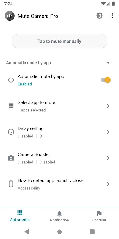 If you are using an automatic muting function, this app's muting function will automatically turn on only while you are using the camera app and will turn off after you close the camera app, so you do not need to worry about turning it off.