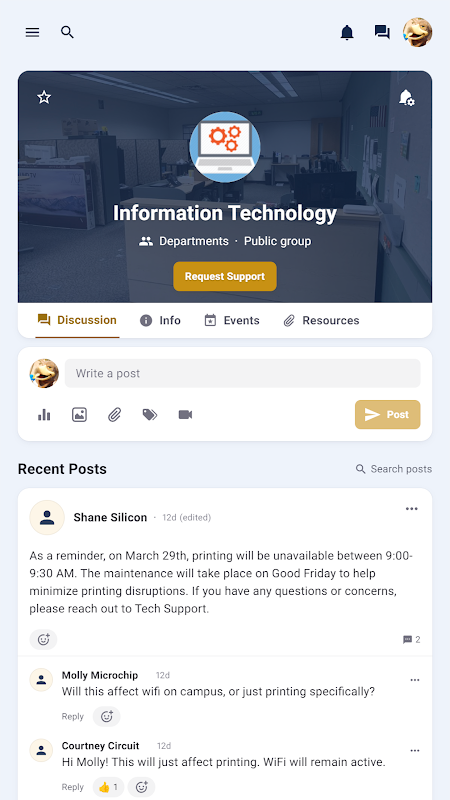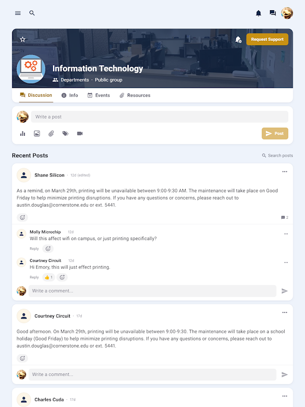 اطلاعیه ها ، گفتگوها ، رویدادها و منابع مهم را در یک مکان مشاهده کنید.