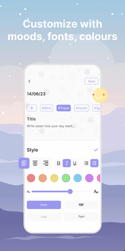 ردیاب خلق و خو: با استفاده از یک ردیاب خلق و خوی بصری احساسات و حالات خود را پیگیری کنید. از میان طیف وسیعی از احساسات انتخاب کنید یا احساسات خود را سفارشی کنید، و احساس خود را هر روز ثبت کنید تا الگوها را شناسایی کنید و بینشی در مورد رفاه عاطفی خود به دست آورید.