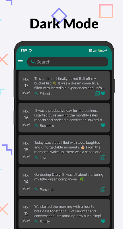 - 🔍 جستجوی خاطرات: بهسرعت هر یادداشت روزانهای را با ویژگی جستجوی داخلی پیدا کنید، بنابراین هرگز ردیابی افکار یا خاطرات مهم را از دست ندهید.
