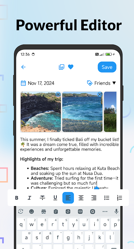 - ✍️ ویرایشگر دفترچه خاطرات پیشرفته با پیوستهای رسانه: خاطرات روزانهای زیبا با فونتها، سبکهای متعدد بنویسید و عکسها را پیوست کنید تا دفتر خاطرات خود را بهتر کنید.