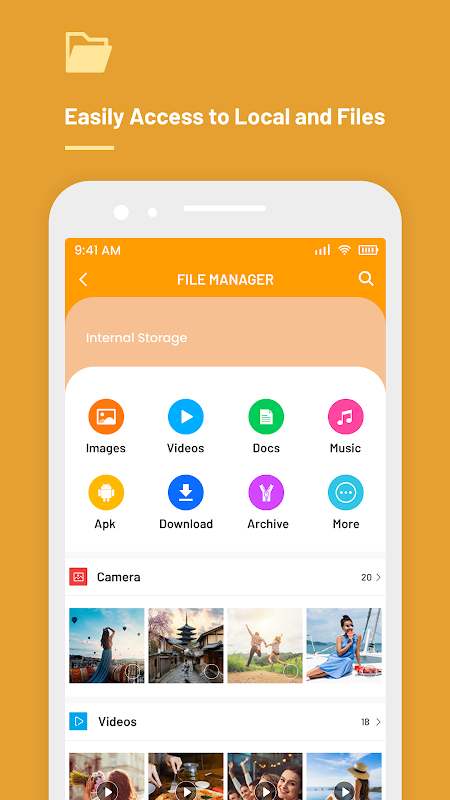 ES File Explorer (File Manager) helps you handle all your files whether they are stored in your device's memory, microSD card, local area network, and cloud storage accounts. Manage your files efficiently and easily with FileMaster! PoMelo File Explorer helps you to access your files by category. With My Files you've got an effective, smooth, and lightweight file manager.