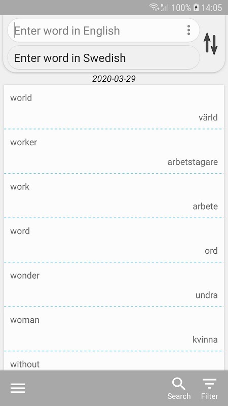 With this app it is easy to build vocabularies and learn many words when studying language. Enter thousands of words in two languages or one word in all languages you study. Words are stored at the touch of a button and can then be found easily through search or filtering if you choose to enter tags.