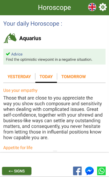 - Daily horoscope (Yesterday, Today, Tomorrow).