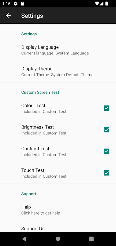 من صفحه نمایش دستگاه می تواند به شما کمک کند به بررسی صفحه دستگاه های خود را. این شامل چهار آزمون، تست رنگ، تست روشنایی، کنتراست و آزمون آزمون لمسی.