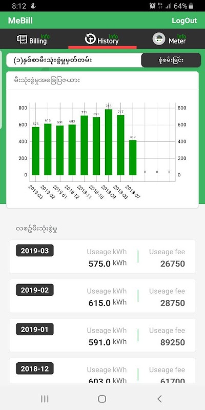 خدمات مشتری برای Myanmar Electric Billing می تواند اطلاعات شارژ پرداختی، اطلاعات مربوط به شارژ که قبلا پرداخت شده است، روند استفاده سالانه و استفاده فعلی در زمان واقعی نمایش داده شود.