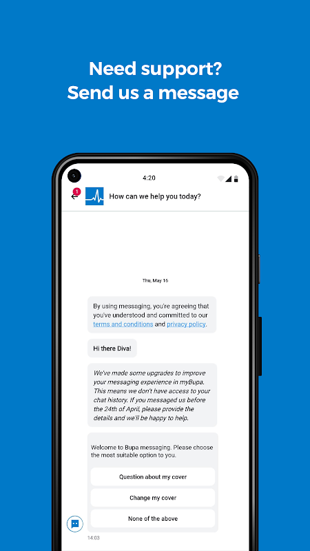 · با استفاده از قابلیت پیام رسانی برنامه با Bupa در تماس باشید