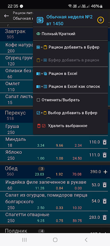 وعده های غذایی خود را با توجه به کالری و BJU برنامه ریزی کنید، وعده های غذایی خود را در اکسل به اشتراک بگذارید.