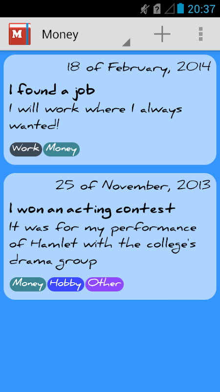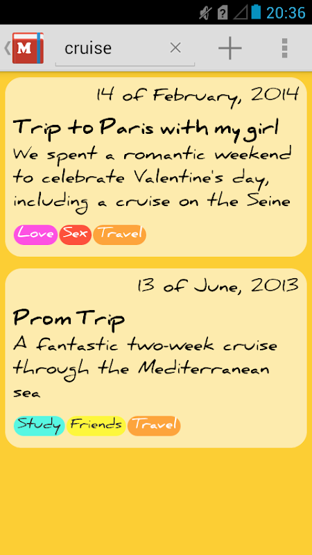 شما می توانید همه چیز شما را در ترتیب زمانی نوشته شده است را مشاهده کنید، تنها رویدادی است که متعلق به یک گروه را مشاهده کنید، و یا جستجو از طریق متن (نوشتن و یا با استفاده از گزینه جستجو صدا) برای مشاهده و یا تغییر یک رویداد گذشته است.