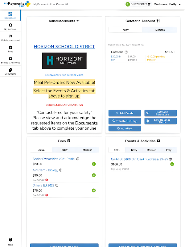 MyPaymentsPlus ، طراحی شده توسط Horizon Software International ، به والدین و سرپرستان 24/7 دسترسی می دهد تا بتوانند حسابهای کافه تریا را برای دانش آموزان در مدارس شرکت کننده مدیریت کنند.