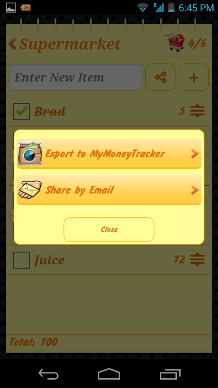 با صادرات قابلیت شما به راحتی می توانید به اعضای خانواده و دوستان و همچنین ارسال لیست خرید خود را به صادرات داده ها به نرم افزار MyMoneyTracker برای مدیریت موثر هزینه های مالی.