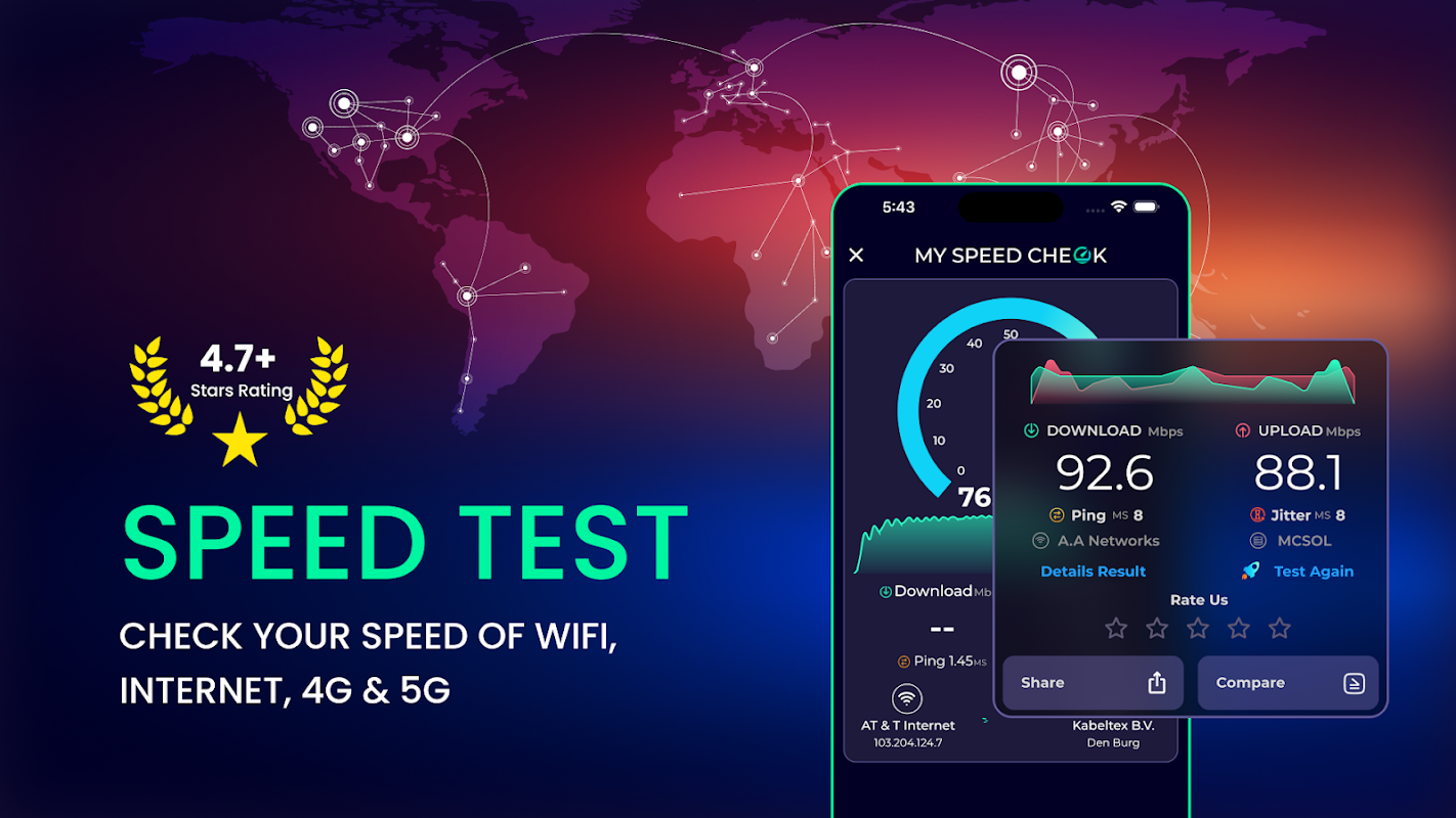 چه در حال آزمایش داده تلفن همراه باشید و چه در حال آزمایش پهنای باند، برنامه My Speed Check هر بار نتایج سریع، قابل اعتماد و شفاف را تضمین میکند.