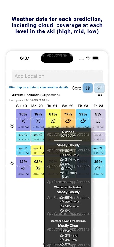برای مشاهده داده های آب و هوا برای آن طلوع/غروب خورشید، روی یک روز ضربه بزنید. حتی اگر طلوع/غروب خورشید عالی نباشد، این داده ها برای کمک به تحقق اهداف هنری منحصر به فرد شما هستند.
