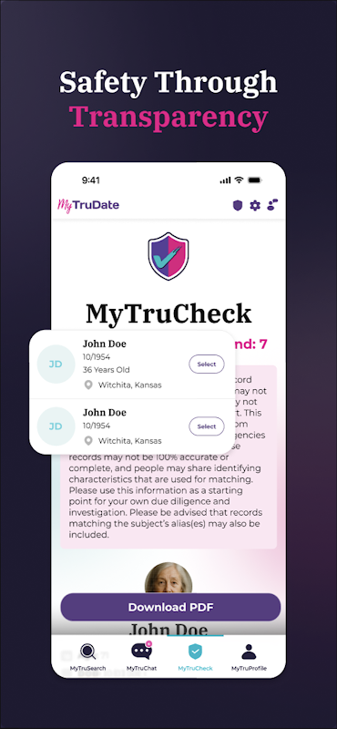 MyTruDate با ارائه آرامش خاطر به اعضا در مورد دانستن اینکه هر کسی که ملاقات میکنند، بررسی جامع سوءپیشینه ما را پشت سر گذاشته است، انقلابی در دوستیابی آنلاین ایجاد میکند. با غربالگری هر کسی که از درهای ما وارد میشود، هدف ما این است که اعضای خود را از بار جستجوی انبوهی از اطلاعات آلوده به موارد زیر رها کنیم: