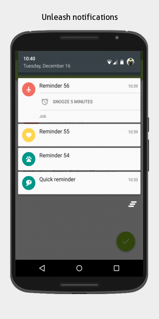 بند باز کردن قدرت از اطلاعیه های آندروید با یادآوری n'4get. هرگز روز تولد یکی دیگر از فراموش کرده ام، آبیاری گل و یا سایر کارهای روزمره. آن را به عنوان "توجه داشته باشید به خودتان"، به فهرست کارهای روزانه و یا برنامه ریز کار توابع و بسیار قابل تنظیم است.