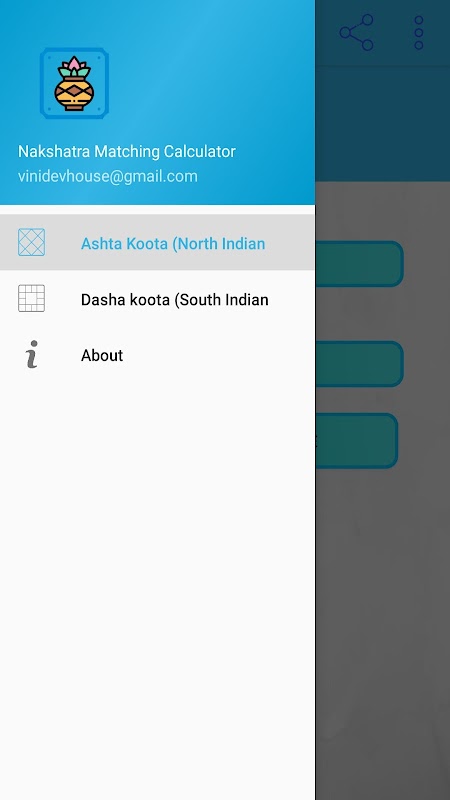این برنامه Nakshatra Matching Calculator اطلاعات مسابقه ازدواج را بر اساس 8 روش تطبیق porutham که توسط طالع بینی شمال هند دنبال می شود ، ارائه می دهد.