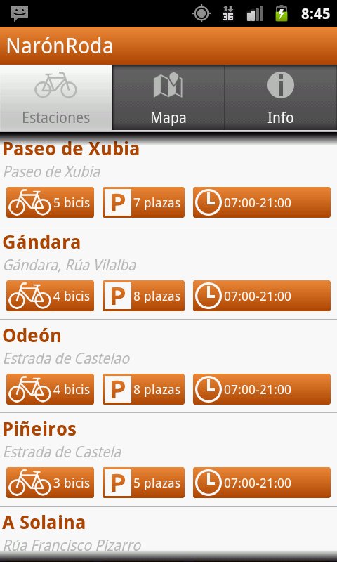 Aplicación para el Servicio de Alquiler de Bicis Públicas del Concello de Narón. Permite conocer el estado de las estaciones de alquiler, bicis disponibles, horario de funcionamiento y localización sobre un mapa de cada una de las estaciones. Además, permite localizar la estación más cercana a partir de la posición actual.