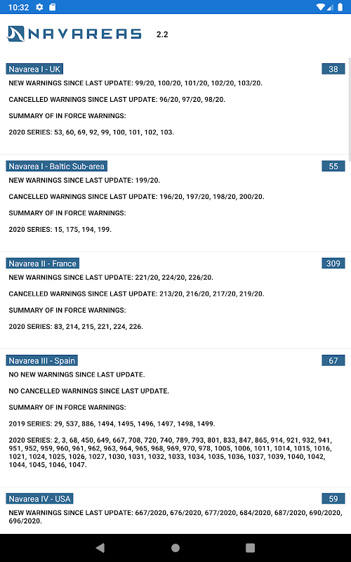 در حالی که کشتی های SOLAS باید از گیرنده Navtex خود برای دریافت آخرین مناطق استفاده کنند، در این داده ها می تواند شکاف هایی وجود داشته باشد، به ویژه اگر شما به یک منطقه جدید حرکت می کنید. Navtex تنها لیستی از اعداد هشدار فعال را فهرست می کند، اما نه متن واقعی هشدار قبلی. با استفاده از برنامه ما می توانید این اطلاعات را به سرعت و به آسانی دریافت کنید.