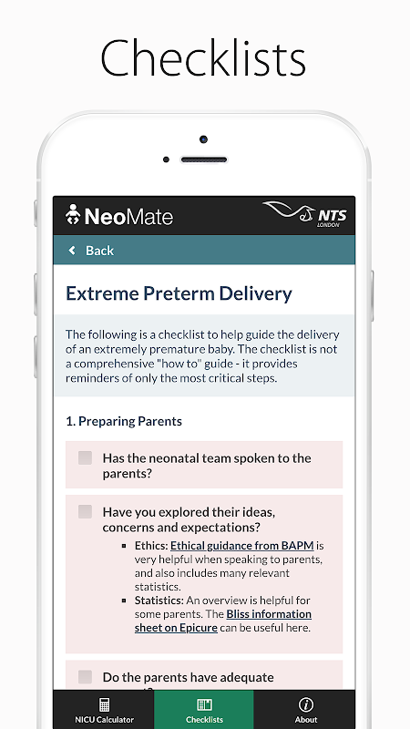 NeoMate کمک می کند تا کارکنان نوزادان به ارائه بهترین مراقبت ممکن را برای نوزادان ناخوشی در بیمارستان. برنامه ارائه می دهد مواد مخدر، تزریق و محاسبات مایع، چک لیست مختصر برای مشکلات بالینی معمول، اطلاعات و مرجع سریع برای هدایت مراقبت های ویژه نوزادان میده.