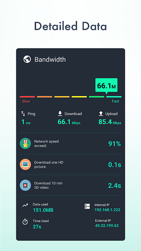 With just one tap, it will test internet speed through thousands of servers worldwide and show accurate broadband speed test results within 30 seconds.