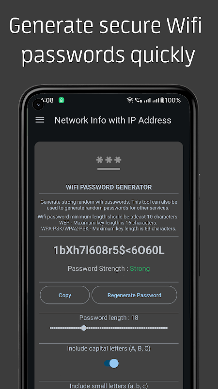 ▪️ شامل یک تولید کننده رمز عبور کاملاً تصادفی برای ایجاد رمزهای عبور ایمن وای فای یا رمزهای عبور برای سایر خدمات است. دارای گزینه های مختلف سفارشی سازی
