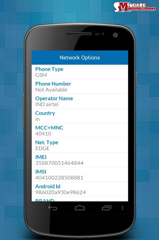 Device Info, operator ID, location(country), IMEI, android ver., Roaming etc.