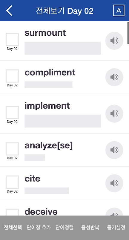 3. نمای کامل: در قالب یک واژگان سازماندهی شده است و به ترتیب کتاب درسی، حروف الفبا و یادگیری تصادفی همه کلمات بر اساس DAY سازماندهی شده است (عملکرد پنهان برای بررسی سریع اضافه شده است!)