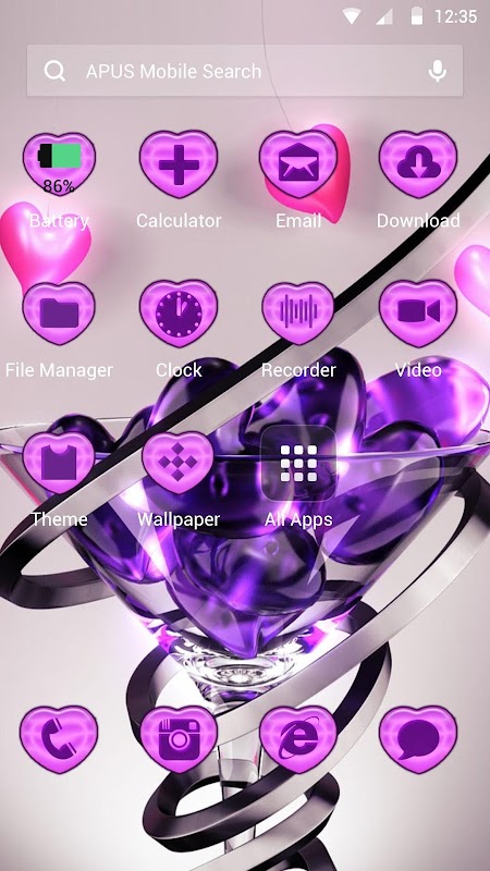 Apply new purple crystal heart APUS launcher free theme to enjoy the fun of diamond wallpaper and luxury heart icons.