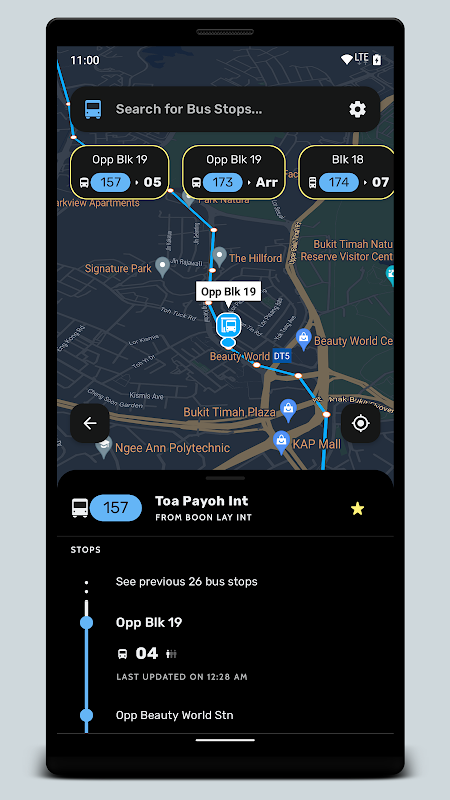یک برنامه ساده و زیبا برای زمان بندی اتوبوس برای سنگاپور (در حالت تاریک)