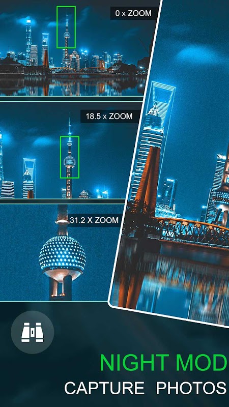 هنگام ضبط در ویرایشگر دوربین زوم حالت شب، می توانید هر زوم 1 تا 8 برابری را تنظیم کنید و در عین حال حساسیت دوربین را به صورت پویا تنظیم کنید تا بهترین نتایج را به دست آورید. همچنین میتوانید عکسها و ویدیوهای خود را در «ایجاد من» با این برنامه ویرایشگر ویدیوی ویرایشگر دوربین زوم حالت شب ذخیره کنید.
