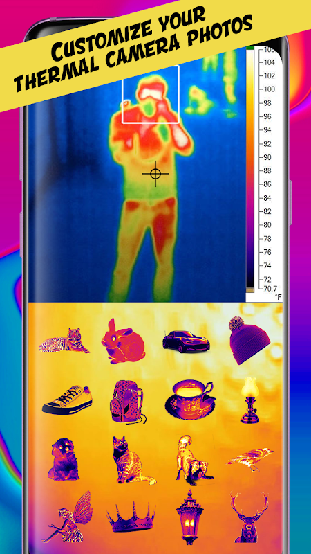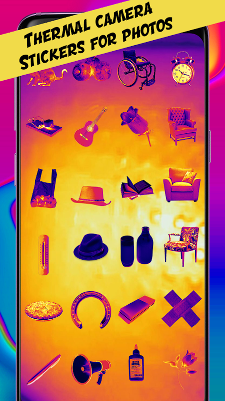 This thermal camera simulator app has not only camera filters and effects, but also numerous fun photo stickers with thermal camera theme, so you can add them as well to your photo editing creation and have a real masterpiece!
