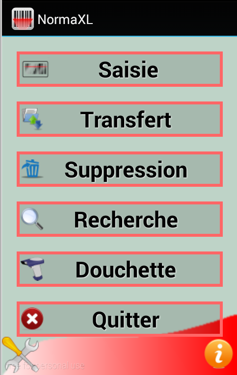 نورما XL نرم افزار برای جمع آوری داده موجودی به پس از آن خالی آنها را به یک برنامه جمع آوری gestion.La را می توان در راه های مختلفی از جمله به رسمیت شناختن بارکد از طریق دوربین انجام می شود. هنگامی که اسیر شده است، داده ها را می توان ویرایش، جستجو، حذف در تلفن. در نهایت، داده ها می تواند توسط WiFi در کار از طریق یک برنامه اضافی را به در PC.Il نصب شود تخلیه همچنین ممکن است به بارگذاری یک پایگاه داده ای از مقالات در گوشی به کنترل اقلام و نمایش طراحی.