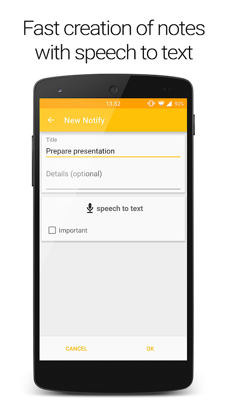 با آسان به شما اطلاع هرگز چیزی را فراموش نخواهد کرد. آگاه کن توجه داشته باشید که شما را به یاد وظیفه خود را و یا هر چیز دیگر است. برای مدیریت Notifys خود را، شما به راحتی می توانید یک لیست جدید ایجاد و اضافه کردن Notifys جدید به آن. همچنین، شما می توانید یک ویجت را بر روی صفحه اصلی خود را برای اضافه کردن و مدیریت یادداشت های خود را به راحتی ایجاد کنید. Notifys را می توان به نوار اطلاع رسانی خود را مواجهه، بنابراین شما باید alwasy نگاهی به یادداشت های خود را. این برنامه همچنین دارای یک سخنرانی خوب به تابع متن، شامل بدون تبلیغات و برای همیشه رایگان است.
