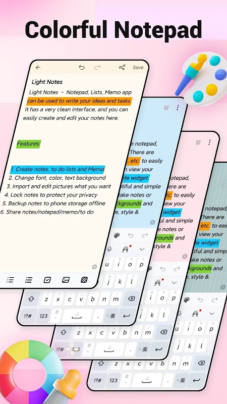یادداشت های نور - دفترچه یادداشت، لیست ها، یادداشت از تغییر رنگ فونت و رنگ پس زمینه پشتیبانی می کند. ما یک کتابخانه مواد غنی داریم و از واردات مستقیم تصاویر و ویدیوها برای غنی سازی یادداشت های شما پشتیبانی می کنیم