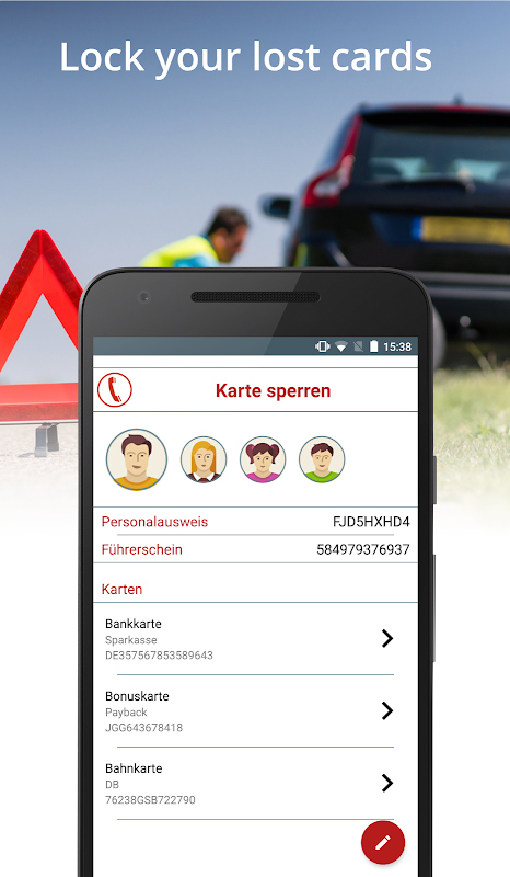 It is possible to enrich your personal data by your identity card id, drivers license ID and an arbitrary number of credit/rail/bonus card ids to have easy access to all of your data in case of robbery/losing. This data is protected by a password and is stored encrypted on your Phone. With this functionality you can directly dial the number of the card cancellation service while getting a summary of all entered card ids.