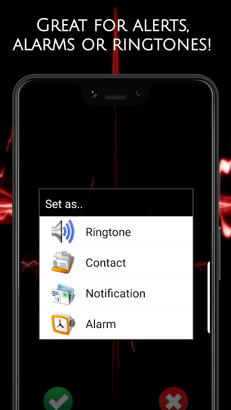 🎵 پیش نمایش و سفارشی سازی: با یک فشار ساده به راحتی پیش نمایش هر صدا را مشاهده کنید. اگر یکی را که دوست دارید پیدا کردید، با فشار دادن دکمه تنظیمات (نماد چرخ دنده قرمز) و انتخاب اعلان، آهنگ زنگ، زنگ هشدار، یا اختصاص آن به مخاطبین خاص، آن را سفارشی کنید.