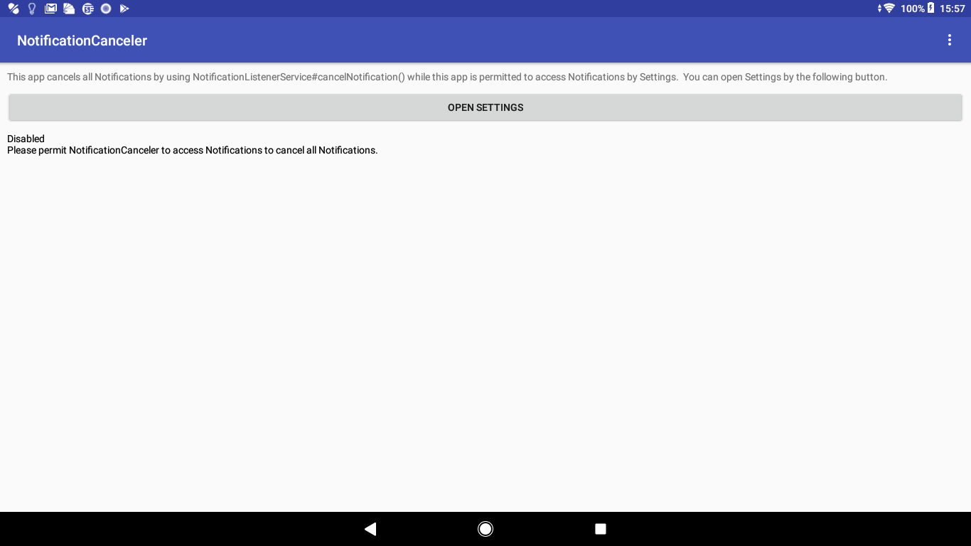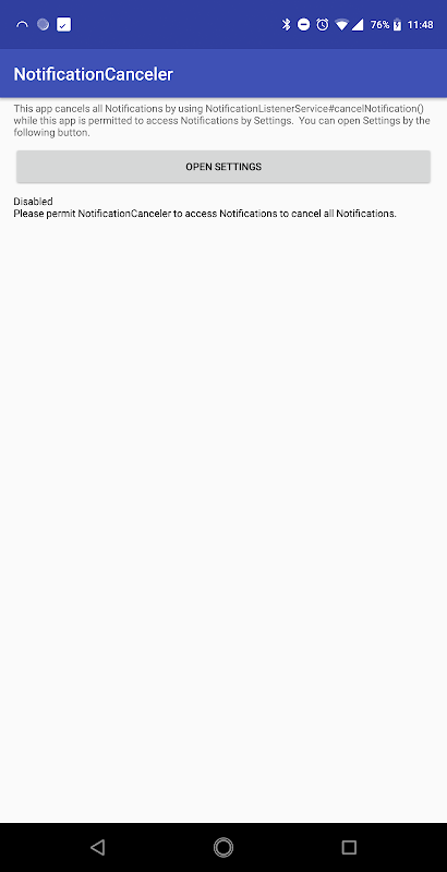 این برنامه تمامی اعلان هایی که FLAG_NO_CLEAR و FLAG_ONGOING_EVENT ندارند با استفاده از NotificationListenerService # cancelNotification () لغو می شود در حالی که این برنامه مجاز به دسترسی به اعلان ها توسط تنظیمات است.