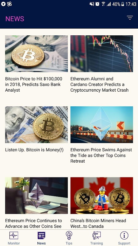 This is an utility app for tracking price change of Crypto Currency. By choosing setting UP and DOWN level by yourself, user can receive the notification immediately when price of their investing coin is down or up.