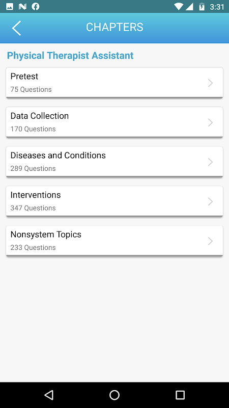 This app contain questions from the book 'Saunders Q&A Review for the Physical Therapist Assistant Board Examination' (ISBN: 978-1-4557-2894-7). With more than 1000 questions, the app provides the practice needed to succeed on the National Physical Therapy Examination (NPTE) for Physical Therapist Assistants. The questions are divided into 4 sections and each section has a wide variety of scenarios, diagnoses, patient populations, practice settings, and types of questions designed to help you prepare for the exam. This is the tool that you need to prepare for the examination with confidence.