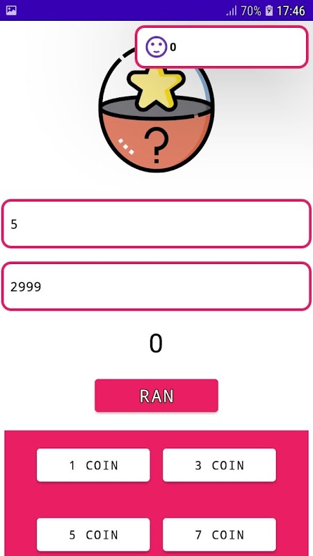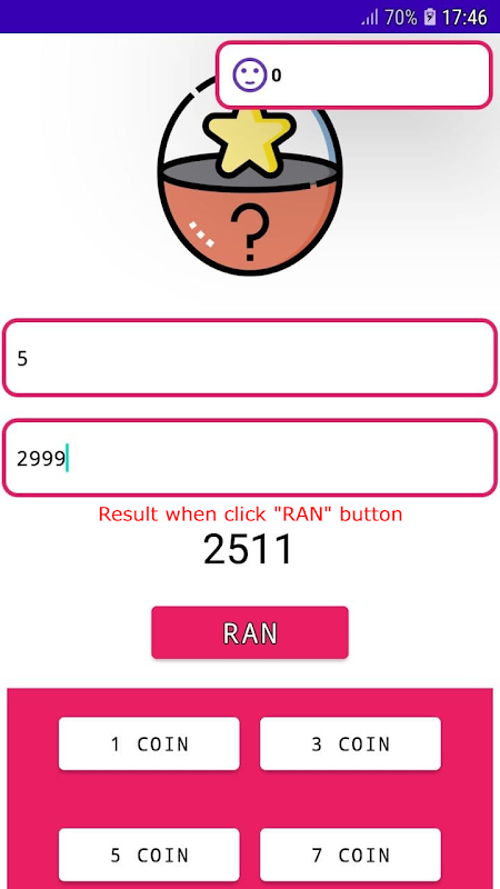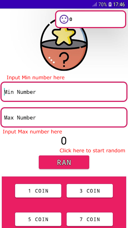 The app will help you easier in random your number, you just simply input your min as well as max number in the text box, then click to the button below them.