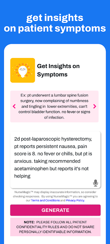 برای اطلاعات بینش در مورد شرایط بیمار، ویژگی Get Insights on Symptoms به شما کمک می کند علائم بیمار را ارزیابی کنید و بینش هایی را در مورد شدت و علل احتمالی آنها ارائه دهید. ویژگیهای توضیحات عمل پزشکی و توصیههای فنی برای پرستاران شما را قادر میسازد تا رویهها یا اقدامات پزشکی پیچیدهتر را به زبان سادهتر توضیح دهید، و اطمینان حاصل شود که بیماران و خانوادهها میتوانند به طور کامل با ترجمه در دسترس باشند.