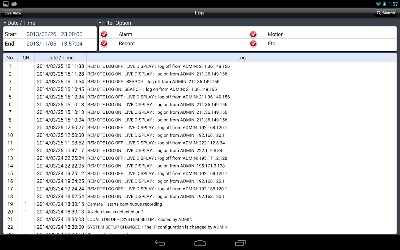 nViewer پشتیبانی فعال، ورود جستجو، گاهشمار جستجو، پخش ضبط، SETUP