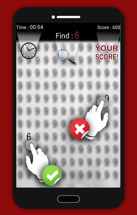 The goal of the game is to find the intruder in a list of numbers, letters and symbols… in a specific time. The player must have a score given in modes of "1 min", "3min" and "5min." Once the required score in each mode is reached the player will therefore continue to step "against the clock" and play up to passage of time.