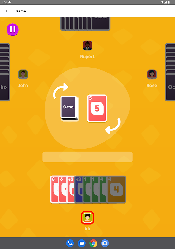 Ocho is extremely addictive and fun to play. The objective is to get rid of all the cards in the hand before anyone else does. Match the cards by color or by number and try to be the first one who will get rid of all the cards and win the game. Unlike the classic game you do not have to declare UNO and there are no challenges for more fluent games. The game works in both Portrait and Landscape orientations. Supports from 2 to 8 players in classic mode and 2vs2, 3vs3, 4vs4, and 6vs6 in team mode.