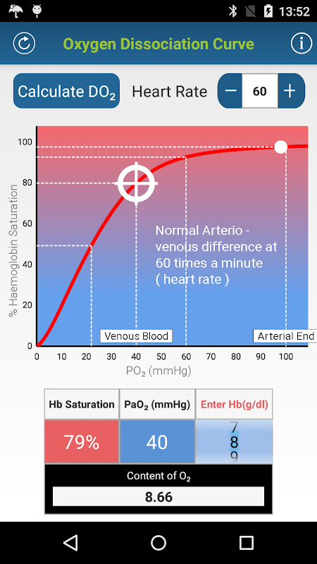 نرم افزار. نشان می دهد که کاهش اشباع هموگلوبین به عنوان حرکت خون از شریان به پایان وریدی و مکان نما نوسان ضربان قلب نشان می دهد که می تواند تغییر کند. این نرم افزار همچنین شریانی وریدی و اشباع نشان می دهد. ارزش P50 نشان دهنده فشار جزئی اکسیژن که در آن هموگلوبین 50٪ اشباع (مشخص شده در برنامه).