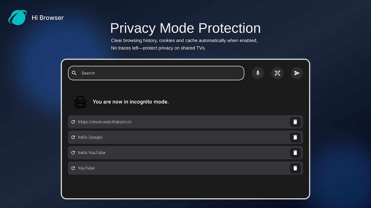 - حالت ناشناس: در صورت فعال بودن، تاریخچه مرور، کوکیها و حافظه پنهان را به طور خودکار پاک میکند، هیچ اثری باقی نمیگذارد و از حریم خصوصی در تلویزیونهای اشتراکی محافظت میکند.